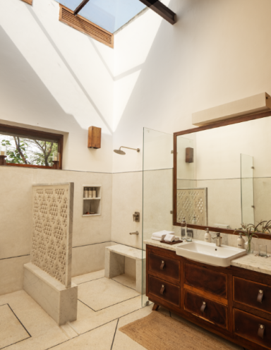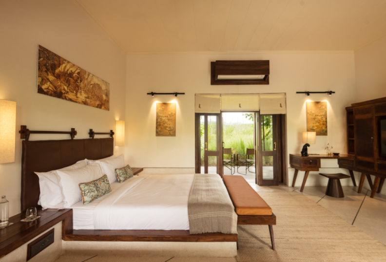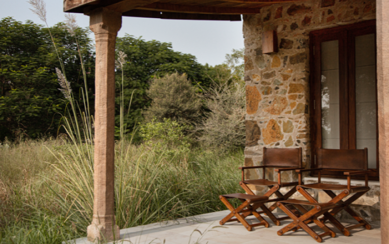 The Mountain Suites offer guests a private retreat with panoramic views of the surrounding hills and grasslands. Each suite features a king-sized bed, a daybed set beside a window, and a dedicated study. Two patios-one at the back with a restored wooden swing, the other at the front with classic lodge seating. The spacious en-suite bathroom includes a walk-in wardrobe and double-height ceiling with a glass roof that fills the space with natural light, complemented by intricately carved jalis. Together, these elements create a private sanctuary, with a seamless connection to the mountains beyond.